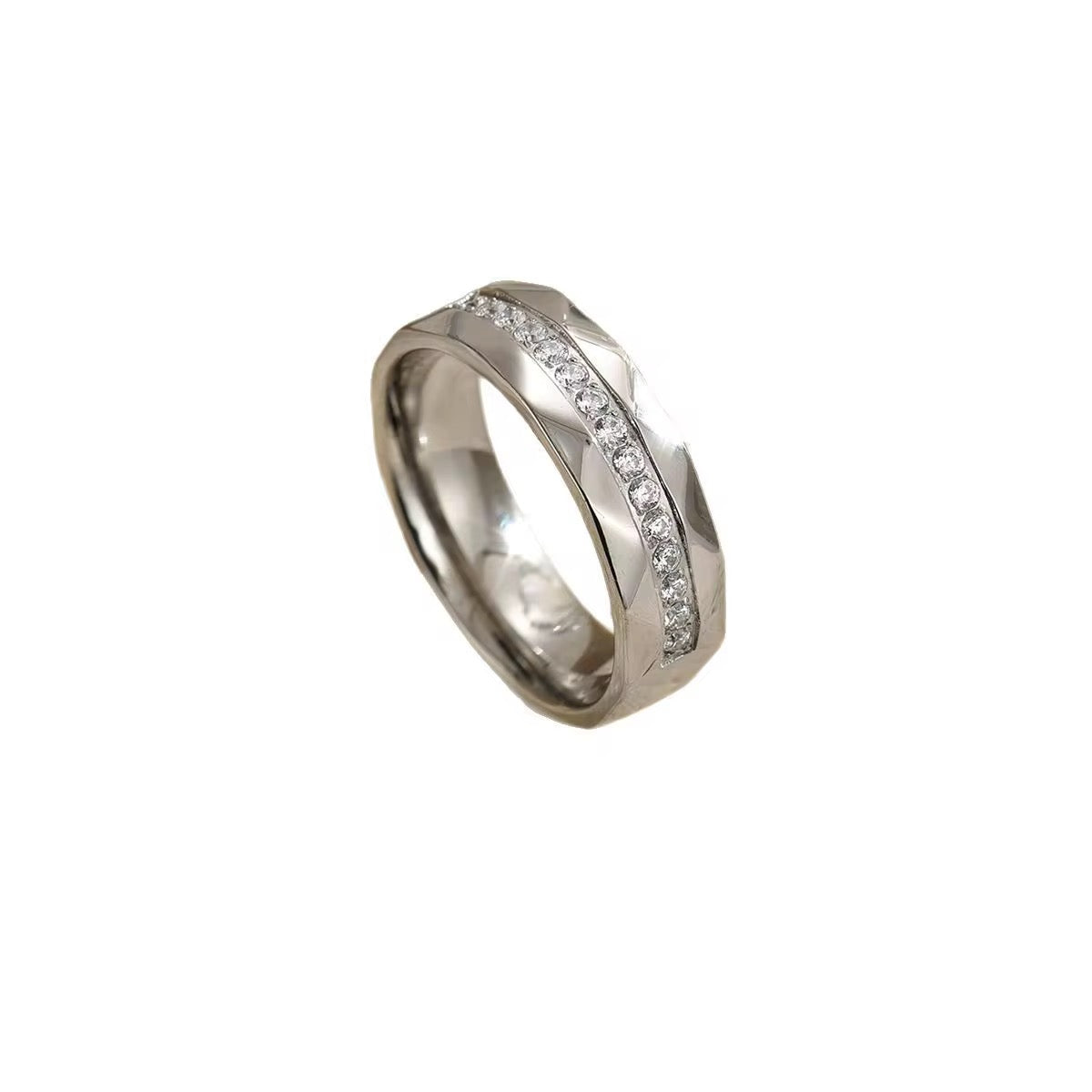 Bold, modern, and endlessly luminous — the Arienne Band Ring is a striking statement of sophistication. Designed with sleek diagonal cuts and a row of sparkling zircon stones encircling the center, this ring captures the perfect balance of texture and shine.